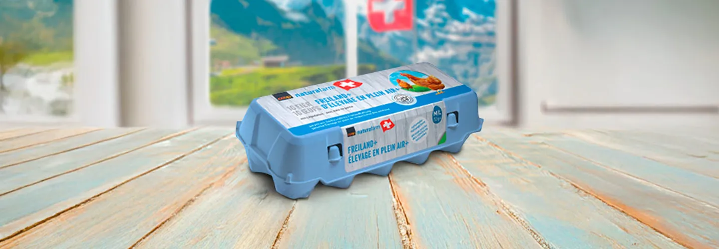 The packaging and wholesaling is handled by the leading Swiss egg-trading company Ei AG. To maximise egg protection, sustainability, and marketing impact, they chose Hartmann’s FSC-certified, moulded-fibre Plus Pack™ range (which gave them 10, 6 and 4-egg size options) – and the imagic2® carton was ideal for the XL eggs.